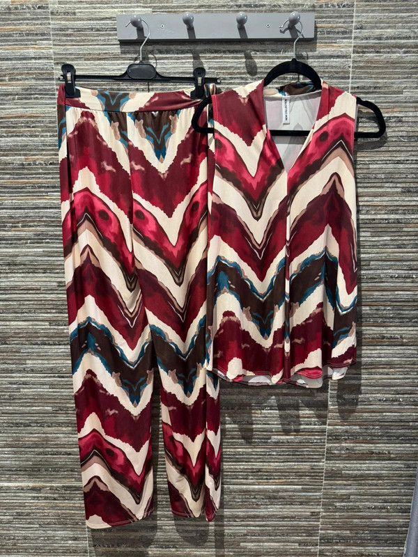 Este conjunto combina elegancia y comodidad en un diseño moderno y versátil ✨. Incluye un chaleco de corte relajado y un pantalón ancho con cinturilla elástica, pensado para brindar libertad de movimiento sin perder estilo 💃. Los tonos beige, rojizos y rosados crean una paleta cálida y armoniosa 🌅. El chaleco, con su caída fluida, aporta un aire sofisticado y fresco, mientras que el pantalón ancho ofrece un ajuste cómodo gracias a su cinturilla elástica, ideal para quienes buscan comodidad sin renunciar a la elegancia 👌. Perfecto para ocasiones casuales o un look de oficina relajado 🏢, este conjunto es clave para quienes valoran el equilibrio entre funcionalidad y estética 🎨.