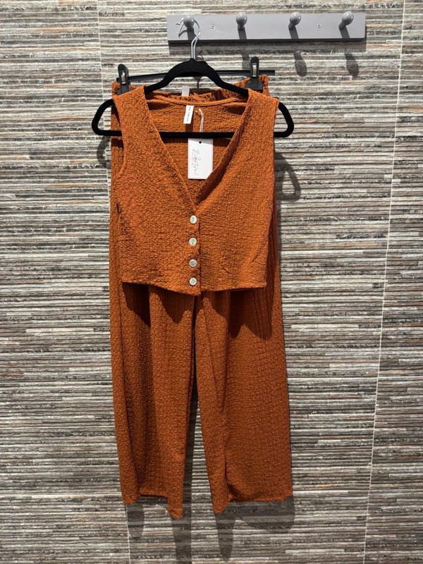 Este conjunto está compuesto por un chaleco y un pantalón ancho en un elegante tono teja 🍂 que aporta calidez y sofisticación a cualquier look. El tejido tiene una textura rugosa pero suave al tacto ✨, combinando estilo y comodidad. El pantalón cuenta con cintura elástica 🧘♀️ que garantiza un ajuste perfecto y libertad de movimiento, mientras que su diseño amplio ofrece un aire relajado y moderno. El chaleco complementa la silueta sin rigidez, creando un conjunto versátil y chic para cualquier ocasión, desde casual hasta formal 🎉👗.